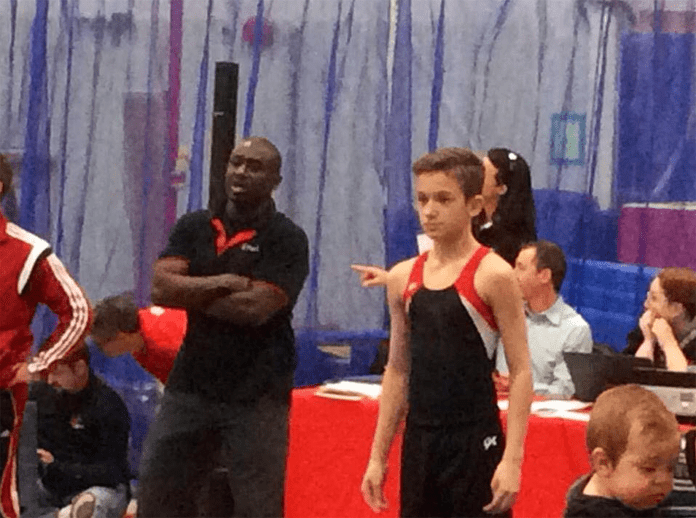 A young male gymnast performing a handstand on the still rings while being spotted by a coach in a professional gymnastics facility.